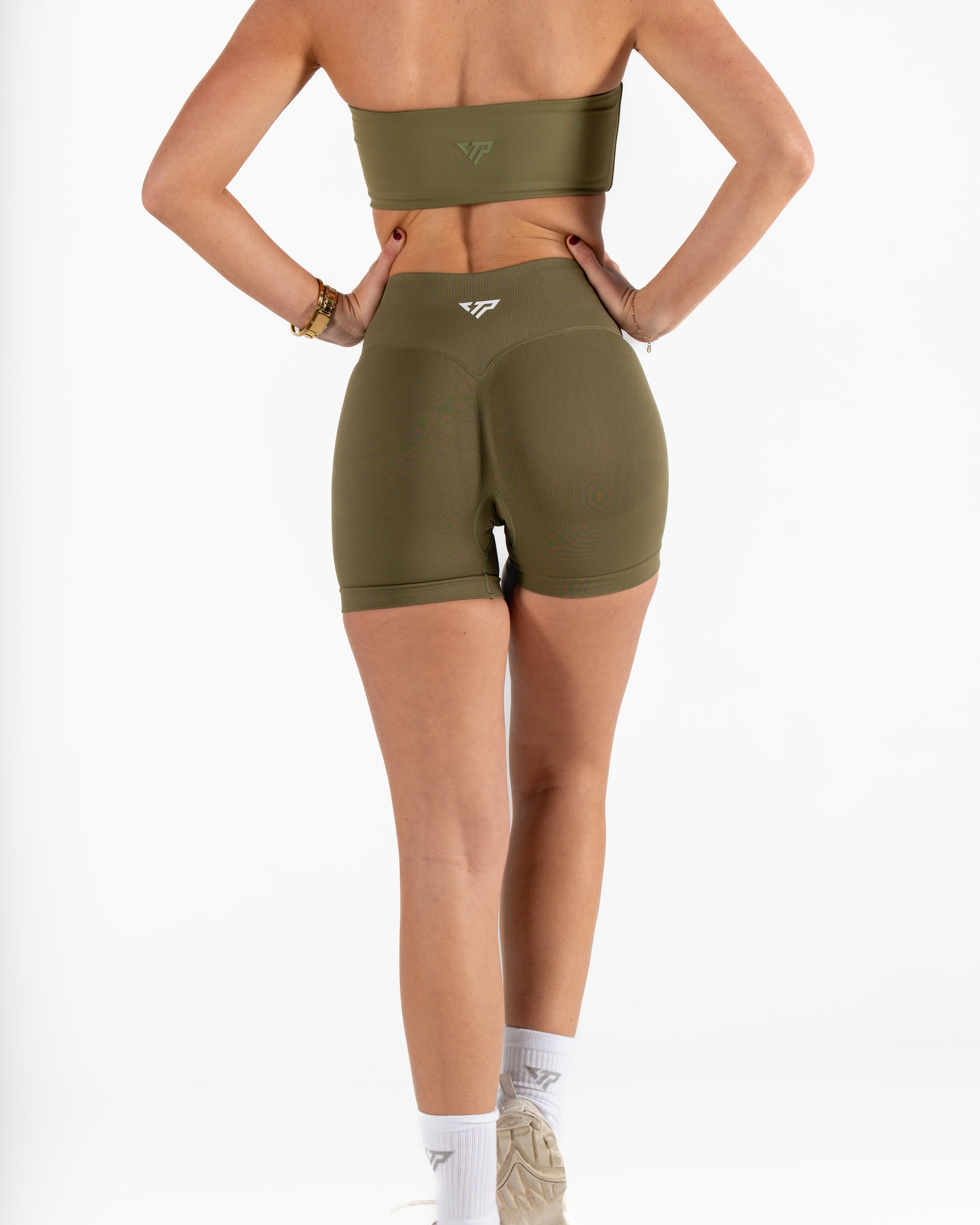 RECOIL HIGH WAIST SCRUNCH SHORTS - DARK KHAKI GREEN